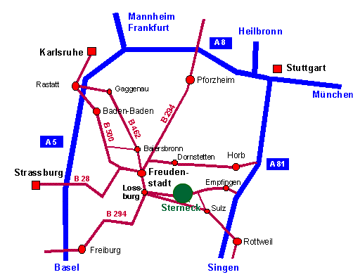 Oder A5 bis Karlsruher Dreieck, dann auf A8 bis Pforzheim-West - B294 Richtung Freiburg bis Loßburg.